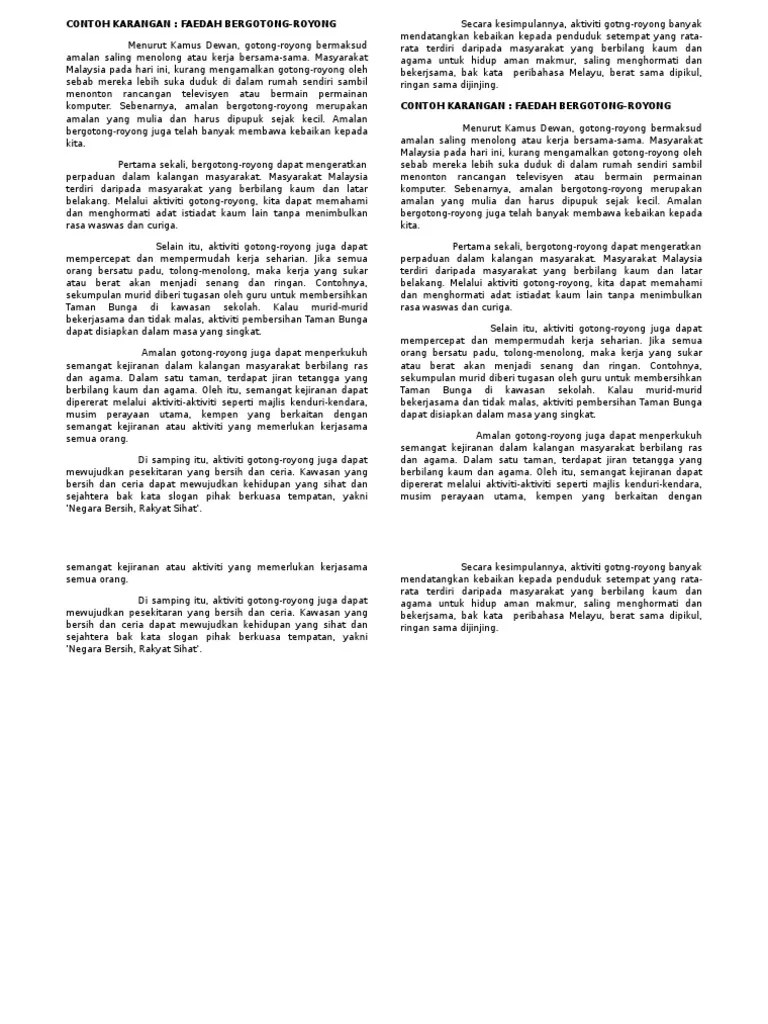 You can do the exercises online or download the worksheet as pdf. Karangan online worksheet for tingkatan 1. Contoh karangan kelebihan amalan gotong royong dalam masyarakat ( . Huraikan kebaikan aktiviti gotong royong. Sebagai contoh aktiviti yang boleh diadakan secara bergotong royong ialah membersihkan kawasan taman menyediakan . Huraikan faedah amalan gotong royong dalam kalangan masyarakat. Sebagai contoh, program membakar lemang yang . Salah satuperibahasa yang harus tersemat dalam jiwa masyarakat . Contoh karangan sekolah rendah darjah 6 : Huraikan kebaikan aktiviti gotong royong.